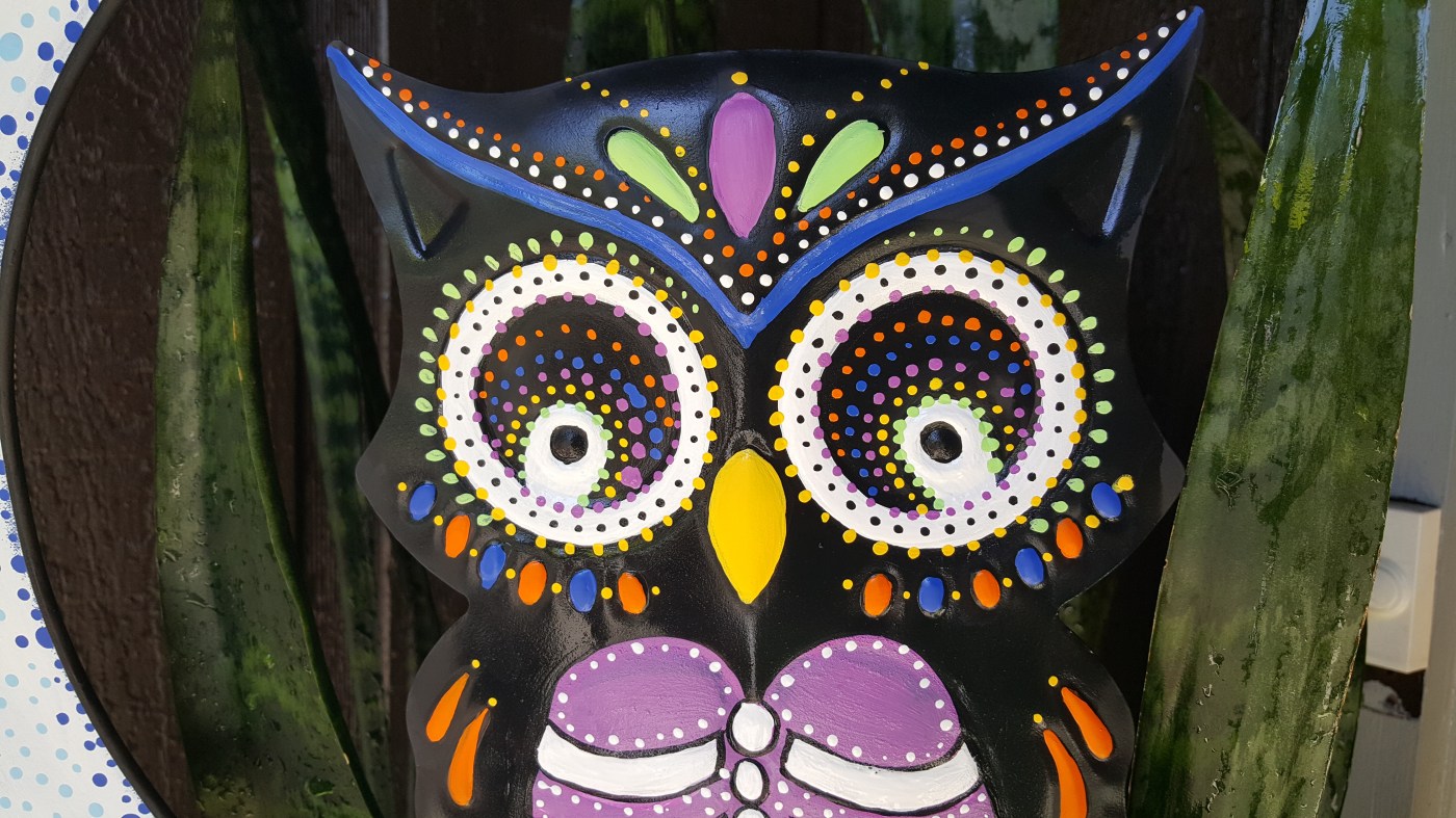 For this challenge, I decided to update a faded little Halloween yard sign I purchased from Big Lots years ago. Originally, I think it was supposed to glow in the dark, but those things never seem to work for me. I loved the little owl perched on a crescent moon, but thought it needed an update and some color! Inspired by the bones on the chest, I chose to go with a Day of the Dead kind of look for that cutie pie owl.